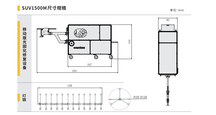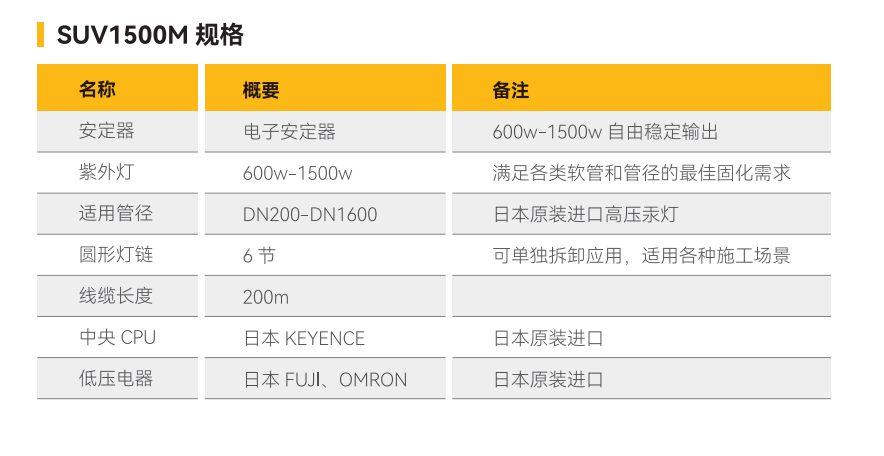 ![]() | SUV1500M的独特功能: ◎核心零部件采用原装进口,国内组装调试完成,保证品质的同时,满足售后服务的及时和高效。 ◎配置21.5寸工业级触摸PC及易于操作的系统。 ◎所有固化信息以及相机图像视频的可视化和记录。 ◎通过USB驱动、数字传输或立即打印固化存储数据。 ◎远程诊断和维护。 ◎采用电子安定器,可通过软件自由切换UV灯功率大小,更好适用不同材料和管径固化需求。 ◎内置耐高温摄像头,通过LED环实现固化前内衬管内照明。 ◎配备多种不同规格传感器,准确探测内壁和空气温度、压力,提高修复成功率。 |