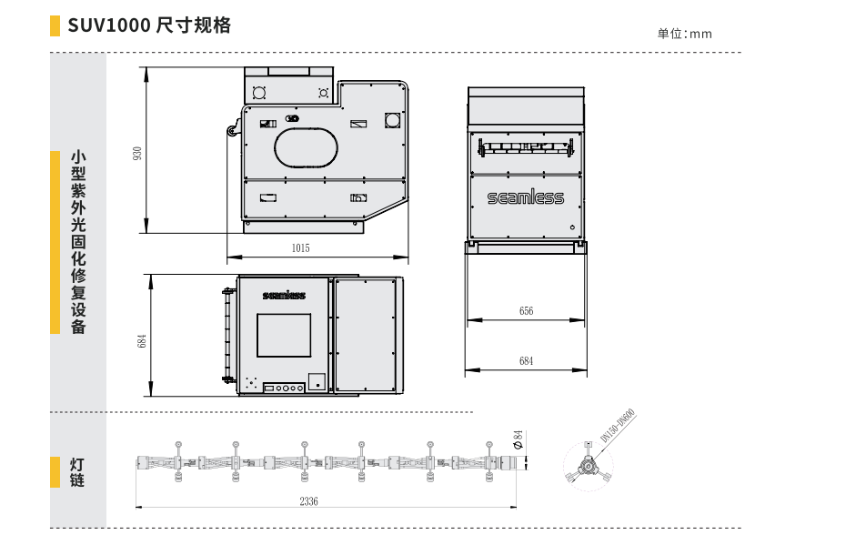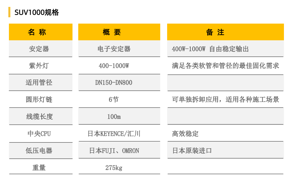 ![]() | SUV1000的独特功能: ◎核心零部件采用原装进口,国内组装调试完成,保证品质的同时,满足售后服务的及时和高效。 ◎六个紫外灯功率从400w-1000w切换,适用于管径DN150-DN800,实现不同材料和管径的最佳固化需求。 ◎圆形灯链每2节可单独拆卸,适用于短管、弯曲管等各种紫外光固化应用场景 ◎适用于小区管网或狭窄巷道等特殊施工场景。 ◎高压汞灯光源,适用于各种紫外光固化修复软管。 ◎配置10.1寸工业级触摸PC及易于操作的系统。 ◎所有固化信息以及相机图像视频的可视化和记录。 ◎通过USB驱动、数字传输或立即打印固化存储数据。 ◎远程诊断和维护。 ◎配备各种传感器、报警监控系统、实时监控设备状态。 ◎采用电子安定器,可通过软件自由切换UV灯功率大小,更好适用不同材料和管径固化需求 |