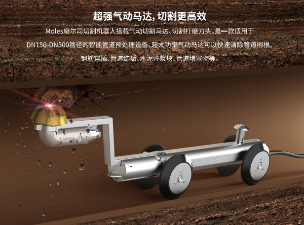 磨尔司切割机器人搭载气动切割马达、切割打磨刀头。是一款适用于DN150-DN500管径的智能管道预处理设备。在原有的管道的维护管理中,在清除管道树根、钢筋穿插、管道结垢、水泥注浆块、管道堵塞物作业,以及重建工程后的削孔作业等,全部可以用用这一台多功能机械完成。